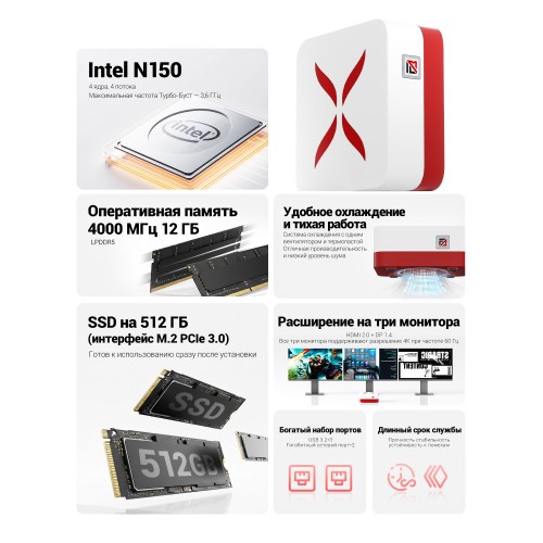 Четырехъядерный процессор Intel N150 с тактовой частотой до 3,6 ГГц обеспечивает стабильную и плавную работу в многозадачном режиме. Он без труда справляется с такими задачами, как обработка офисных документов, просмотр веб-страниц, воспроизведение HD-видео и несложная творческая работа.