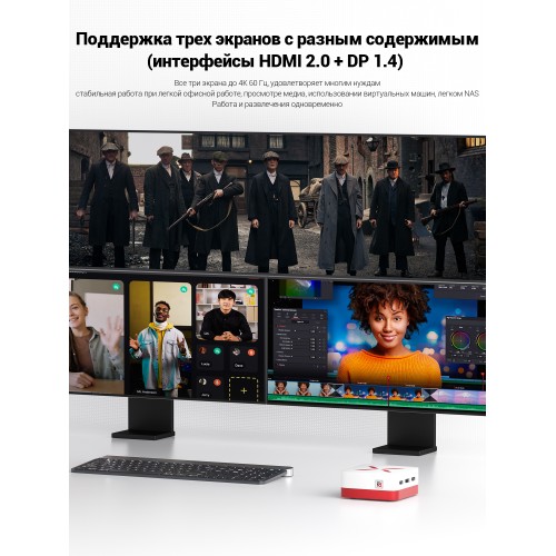 Мини-ПК T3, оснащенный двумя портами HDMI 2.0 и одним портом DP 1.4, поддерживает одновременное или расширенное отображение на трех экранах. Будь то многозадачность, графический дизайн или мониторинг, он повышает эффективность работы с визуальными эффектами и обеспечивает бесперебойную работу на нескольких экранах.