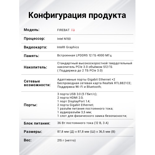 Мини-ПК Firebat T3 (Intel N150, RAM 12 ГБ, SSD 512 ГБ)