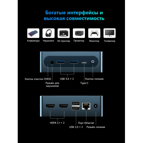 В основе BMAX B4 Ultra лежит процессор Intel N150 13-го поколения с 4 ядрами и частотой до 3,6 ГГц в режиме Boost. Устройство оснащено 12 ГБ оперативной памяти LPDDR5 (4400MHz) и твердотельным накопителем M.2 объемом 512 ГБ с поддержкой NVMe и возможностью расширения до 2 ТБ. Компьютер поддерживает подключение двух дисплеев через HDMI 2.1 с выводом изображения в разрешении 4K при 60 Гц. В числе интерфейсов — USB 3.2, USB Type-C, USB 2.0, гигабитный Ethernet, а также Wi-Fi 5 и Bluetooth 5.0. Система охлаждения обеспечивает уровень шума около 40 дБ.