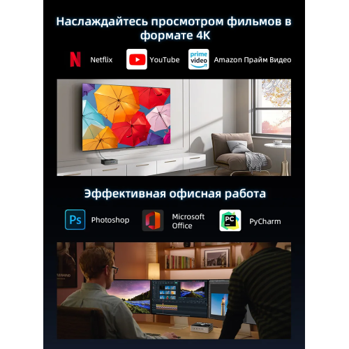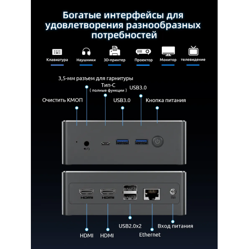 Сетевая оснащённость. Два гигабитных Ethernet-порта (один 2.5 GbE + один 1 GbE) делают мини-ПК идеальной основой для домашнего сервера, сетевого хранилища (NAS) или точки доступа с приоритезацией трафика.