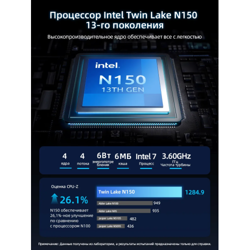 Процессор: Intel N150, 4 ядра, 4 потока.