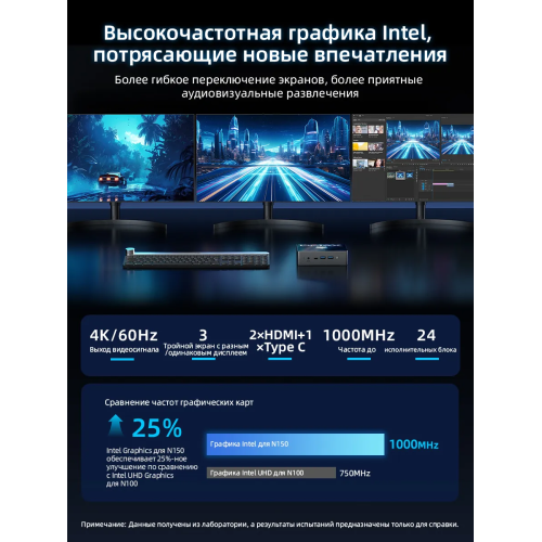 Устройство считается одним из доступных и сбалансированных вариантов на базе процессора Intel N150 (Alder Lake-N). Компактный размер.