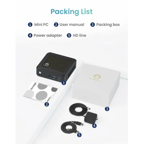 Комплектация - Мини-пк, адаптер питания, руководство, коробка.
